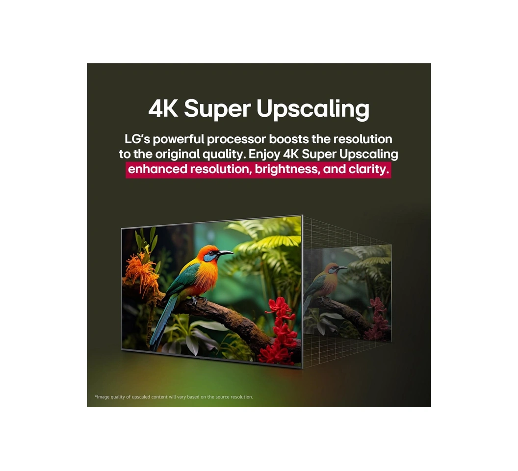 At the core of the LG 43UA80006LC UHD 4K Smart TV HDR10 webOS25 2025 is the advanced α7 AI Processor Gen8, engineered to deliver optimized visuals and audio using deep-learning algorithms. This processor analyzes every frame, automatically adjusting brightness, contrast, and color tone to match the content and lighting environment. It ensures every image is rendered in true-to-life detail with balanced highlights and shadows.