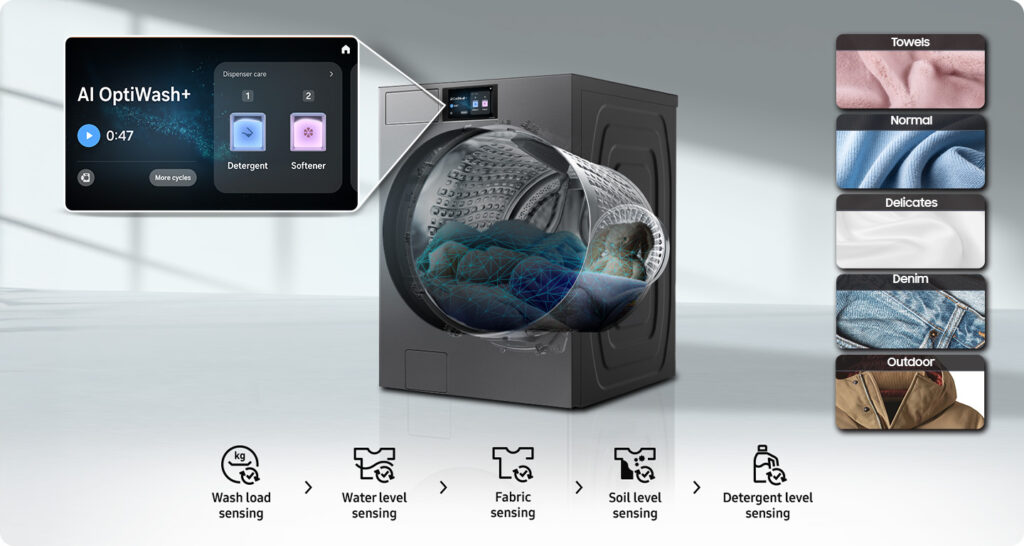 At the heart of the WF90F26ADSNQ’s performance is AI Wash+—a smart washing system that automatically senses the weight of your laundry, the type of fabrics, and the level of soiling. It then adjusts water levels, detergent dosage, and cycle duration to deliver the most efficient and effective clean. Samsung’s AI Ecobubble™ technology creates rich, soapy bubbles that penetrate fabrics up to 40 times faster than conventional washing, ensuring deep cleaning at lower temperatures, which saves energy while protecting delicate fibres. Additionally, the Less Microfiber Cycle is designed to reduce the release of microplastics by up to 39%, a valuable feature for environmentally conscious households and businesses. This intelligent technology not only guarantees spotless results but also optimises resource use for maximum cost-efficiency.